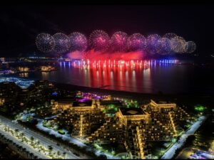 وعقب عرض الطائرات المسيَّرة، انطلقت الألعاب النارية في عرضٍ مبهرٍ امتد على طول ستة كيلومترات من جزيرة المرجان إلى منطقة الحمراء، مع العد التنازلي حتى منتصف الليل.